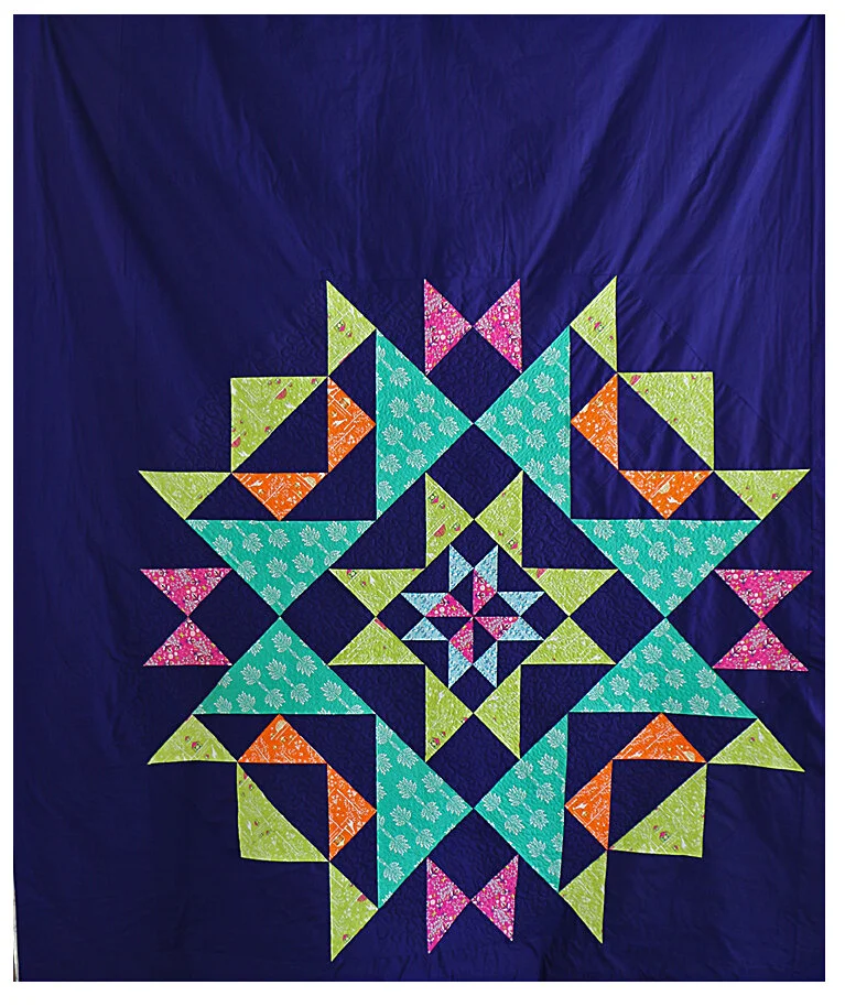 This quilt has been a bear to work on. It went through more design changes than I care to mention—I made changes literally right up until I sewed the last seam! But I think the beautiful colors of the Safari Moon line positively shine when paired with this background color, which is Kona Cotton in Regal (another one of my new favorites, I think!).