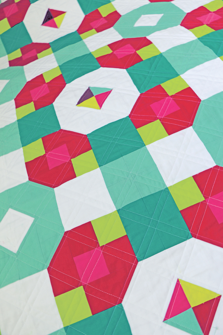 I used many of my absolute favorite Kona shades in this quilt: Bluegrass, Aloe, Pomegranate, Azalea, Chartreuse, Cactus, Cerise, and White. These are colors that I tend to come back to over and over in my quilting—this quilt is like my own personal library of Kona faves.
